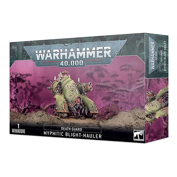 Powering into battle on a trio of articulated track units, the Myphitic Blight-hauler is a light Daemon Engine that provides the Death Guard with heavy firepower wherever it is needed. Resembling a Bloat-drone that has been stripped of its turbines, this strange machine has heavy weapons mounted on its carapace, and its rusting armoured plates can absorb impressive punishment – as can its blubbery exposed flesh-parts, which soak up appalling trauma.