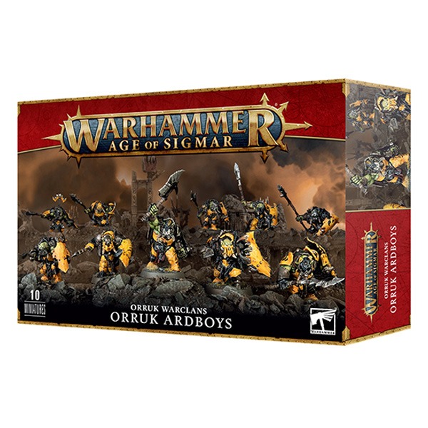 This multipart plastic kit builds 10 Orruk Ardboyz, the frontline fighters of the Ironjawz clans. Each Ardboy carries a hefty slab-like shield, and can be armed with either a choppa or a long-handled stikka. You can build one model as an Ardboy Boss to lead the mob with a unique choppa and a choice of heads, and another model as a Gorkamorka Glyph Bearer who carries one of two different back-mounted glyphs.