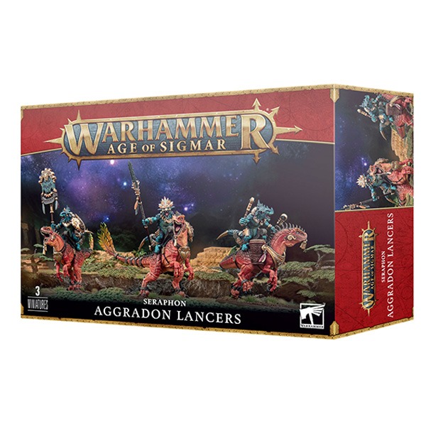 Aggradon Lancers are among the most aggressive cavalry known to the Mortal Realms, for their fearsome scaled steeds only become swifter and more ravenous as battle-frenzy overtakes their senses. A charge of Aggradon Lancers can collapse entire battlelines in a storm of predatory violence, riders and mounts alike lashing out with savage force and overwhelming ferocity.